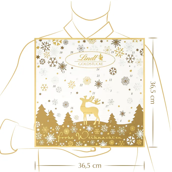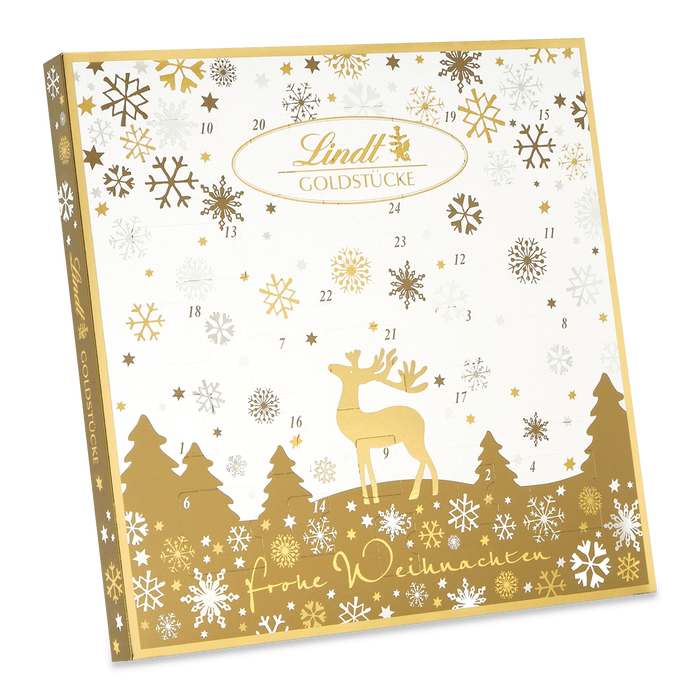 Adventskalender von LINDT versüßen die Wartezeit auf Weihnachten. Wenn zu Weihnachten Gold und Weiß zusammentreffen, entsteht ein Hauch von Luxus. Ab Dezember geht die Vorfreude auf Weihnachten los. Ob für Alt oder Jung: Adventskalender sind hier unverzichtbar, denn sie versüßen Tag für Tag die Wartezeit auf Weihnachten. Hinter allen Türchen warten Überraschungen aus feinster LINDT Chocolade. Alle 24 Türchen steigern mit feinstem Schokoladengenuss Tag für Tag die Vorfreude bei großen und kleinen Genießern. Innenteil aus Karton.